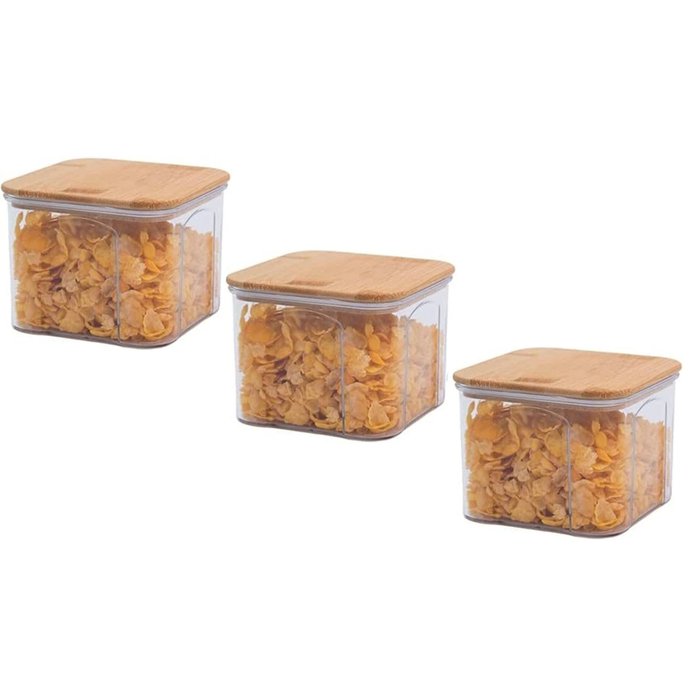 Kit 3 Potes Hermético Acrílico Quadrado Tampa Bambu 650ml