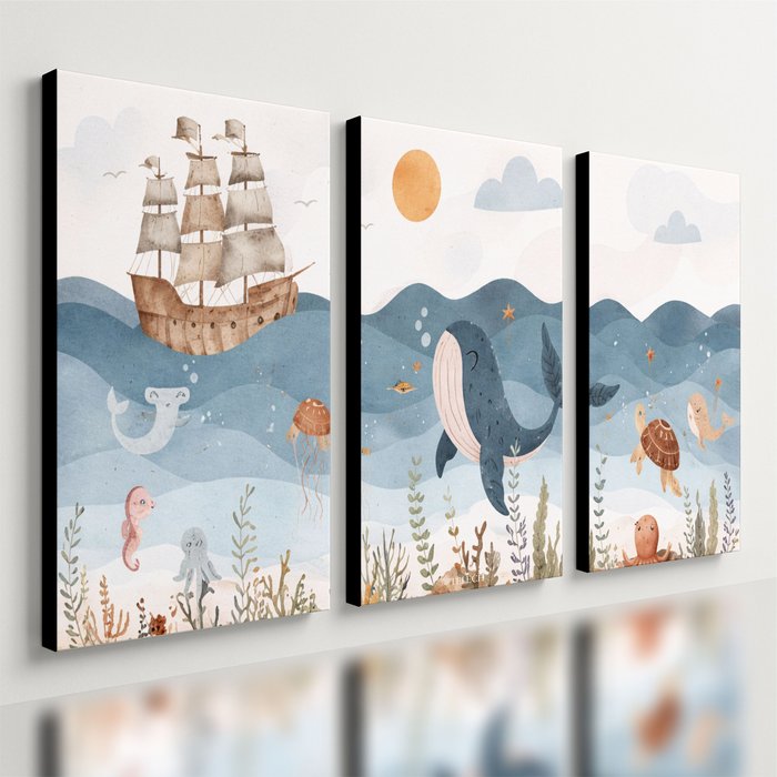 Kit 3 Quadro Decorativo Mar Infantil Quarto Criança Navio Qualidade Premium 28x20cm