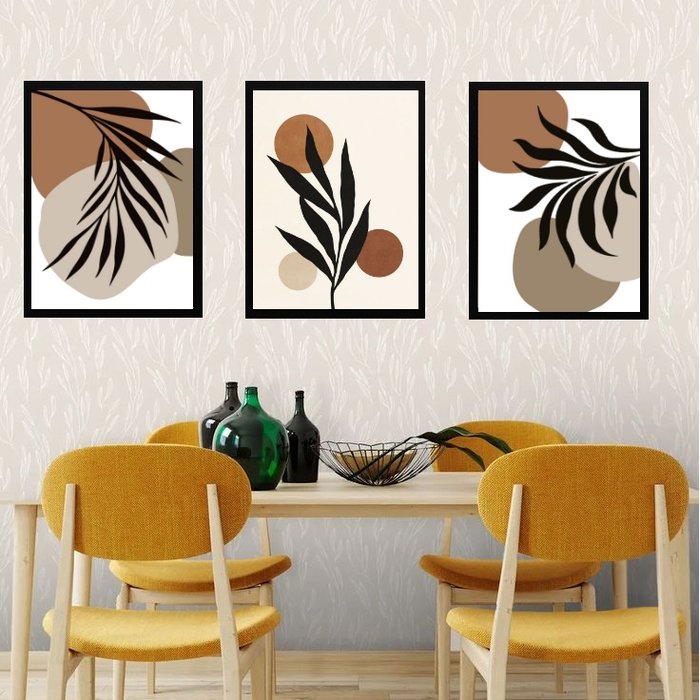 Kit 3 Quadros Abstratos Orgânicos - Folhas 33x24cm - com Vidro:madeira Preta