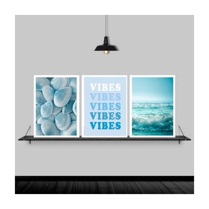 Kit 3 Quadros Azuis Mar Vibes 45x34cm - com vidro:Madeira preta