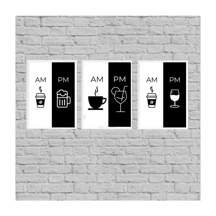 kit 3 Quadros Café Bebidas Alcóolicas- AM PM 33x24cm:Madeira branca