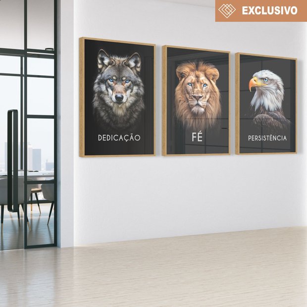 Kit 3 Quadros Decorativo Dedicação Fé Persistência em Cores Lobo Leão Águia Sala Quarto Casa Escritó Moldura Amadeirado Claro + Vidro