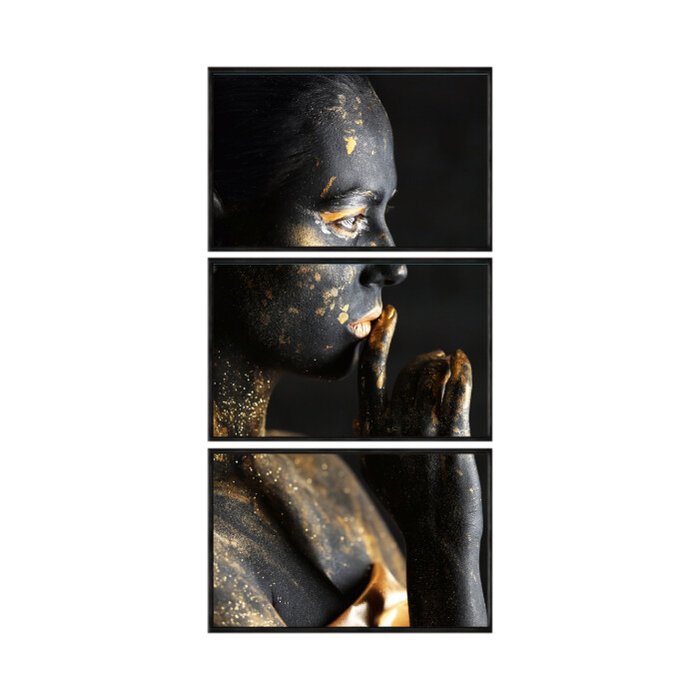 Kit 3 Quadros Decorativos 40x60cm Vidro Mulher Perfil Preta e Dourada Art009k Preta e Dourada