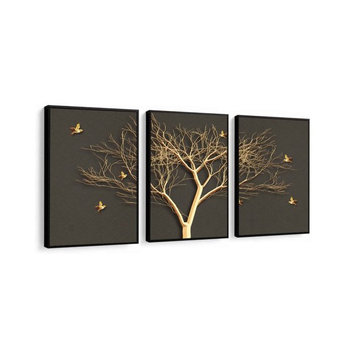 Kit 3 Quadros Decorativos Arvore Dourada Galhos Para Sala De Estar Conjunto Com Molduras Preto