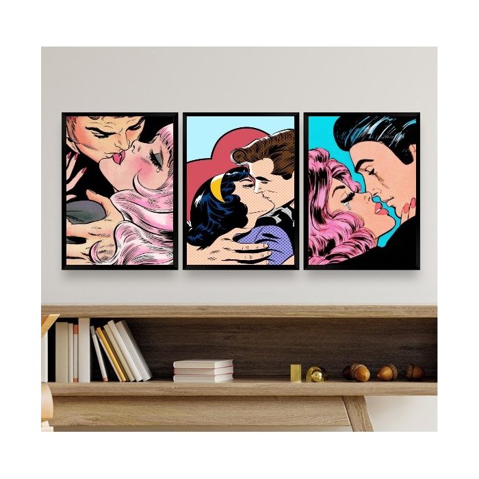 Kit 3 Quadros Decorativos Beijo Pop Art - Casais 45x34cm:madeira Branca