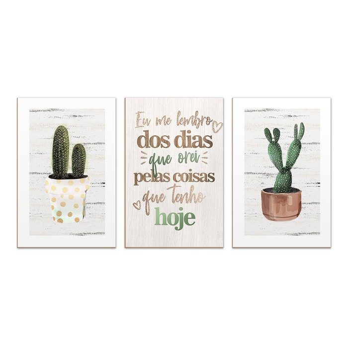 Kit 3 Quadros Decorativos Cactos Verde Frases -