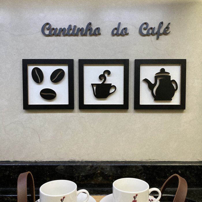Quantidade: 3 unidades de quadros + frase Cantinho do Café.Dimensões: Quadro 15,0 cm X 15,0 Espessura: 1,2 cm. Moldura, Figuras e Frase: MDF Melamínico alta resistência e durabilidade Preto ou Branco.