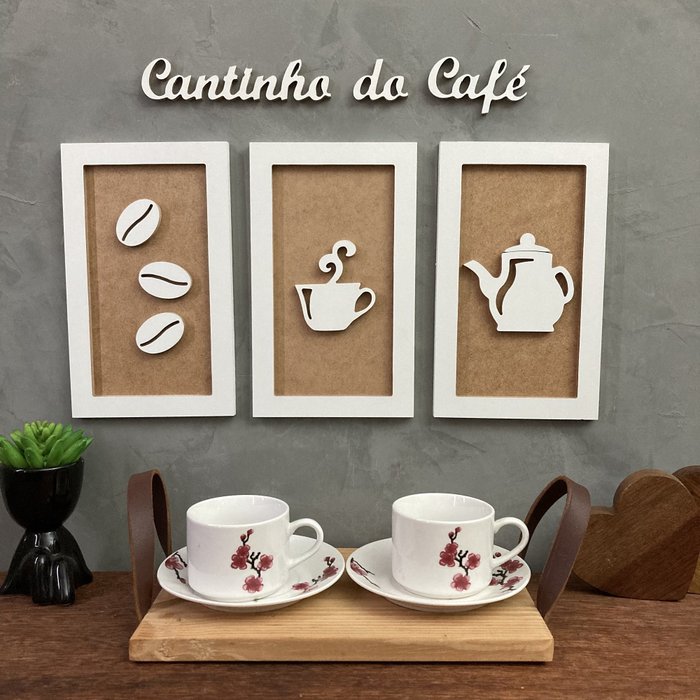 Quantidade: 3 unidades de quadros + frase Cantinho do Café.Dimensões: Quadro 15,0 cm X 25,0 Espessura: 1,2 cm Moldura, Figuras e Frase: MDF Melamínico alta resistência e durabilidade Preto ou Branco.