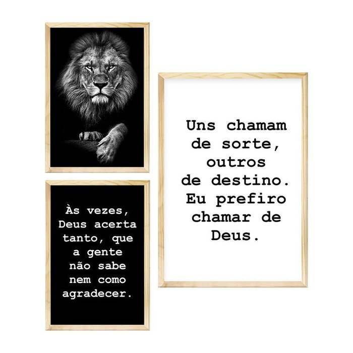 Kit 3 Quadros Decorativos para Hall Entrada Frases Leão Fé Sala com Moldura Pinus Preto e Branco