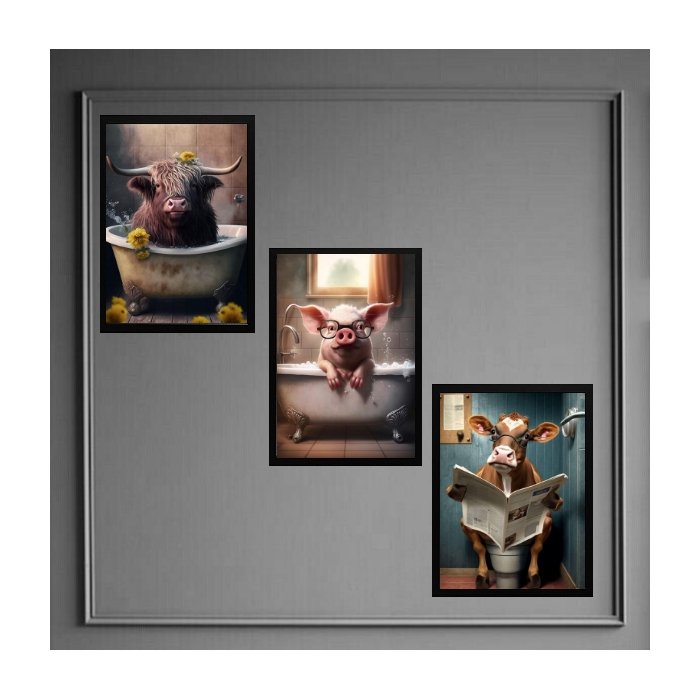 Kit 3 Quadros Divertidos Banheiro de Sítio 24x18cm - com Vidro:madeira Preta