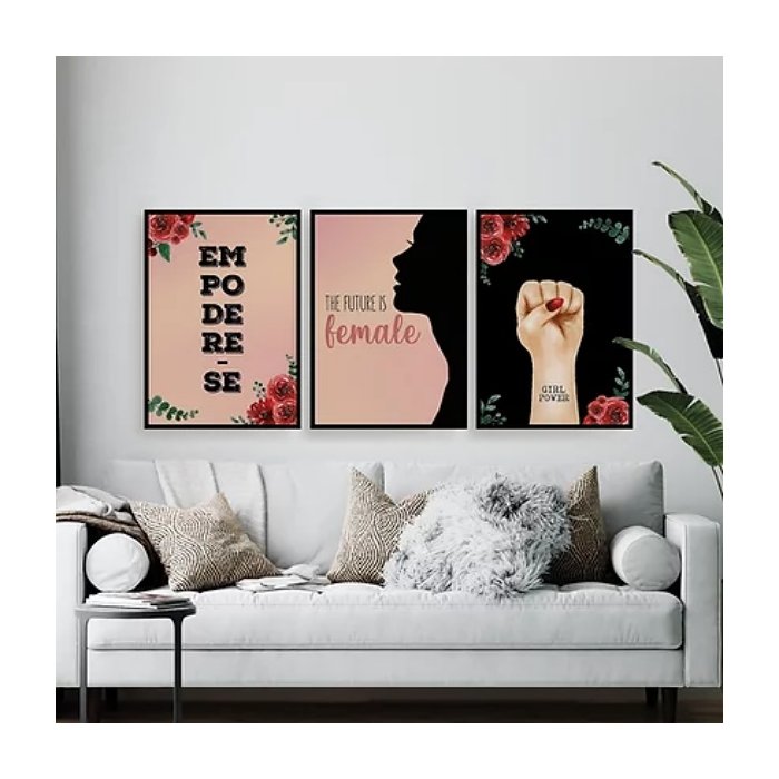 Kit 3 Quadros Feministas Empodere-se 45x34cm - com vidro:Madeira branca