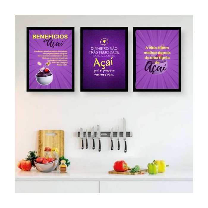 O Kit 3 Quadros Decorativos Frases Açaí 24X18Cm - Preta é perfeito para dar um toque especial à decoração do seu quarto, sala, cozinha, escritório, área gourmet e muito mais. Chega de paredes vazias!Com esses quadros, você terá um ambiente ainda mais charmoso..