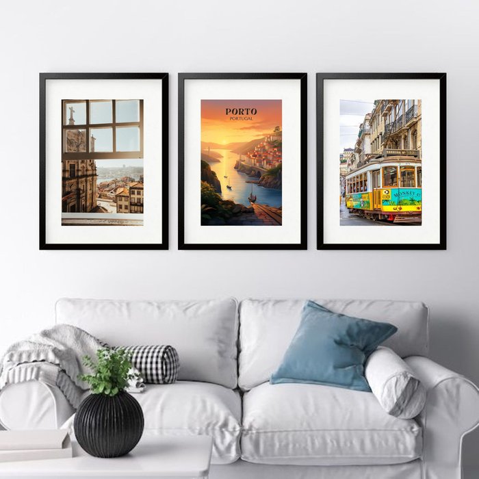 Kit 3 Quadros Grandes Portugal - 60x48cm:moldura Preta Moldura Preta