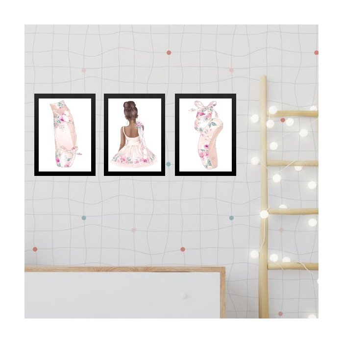 Kit 3 Quadros Infantis Bailarinas Morenas 33x24cm:madeira Preta