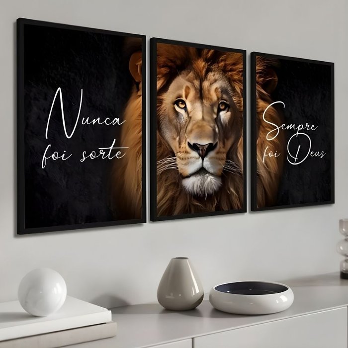 Kit 3 Quadros Leão Nunca Foi Sorte Sempre Foi Deus Moldura:preta