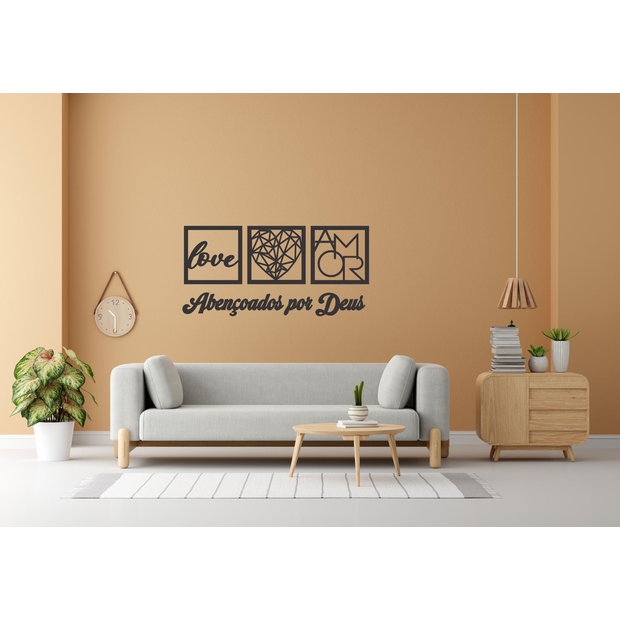 Kit 3 Quadros Mdf-love, Coração Geométrico e Frase Religiosa Preto
