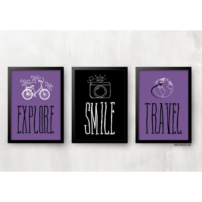 Kit 3 Quadros para casa - Viagens Explore Travel Smile:Branca
