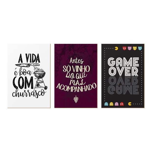Kit 3 Quadros para Decoração Frases Churrasco Jogos Cozinha -