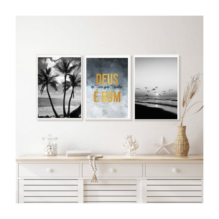 Kit 3 Quadros Praia Deus É Bom Preto e Branco 45x34cm - com Vidro:madeira Branca