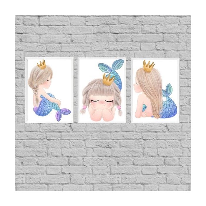 Kit 3 Quadros Sereinha Infantil Menina 24x18cm:Madeira preta preta