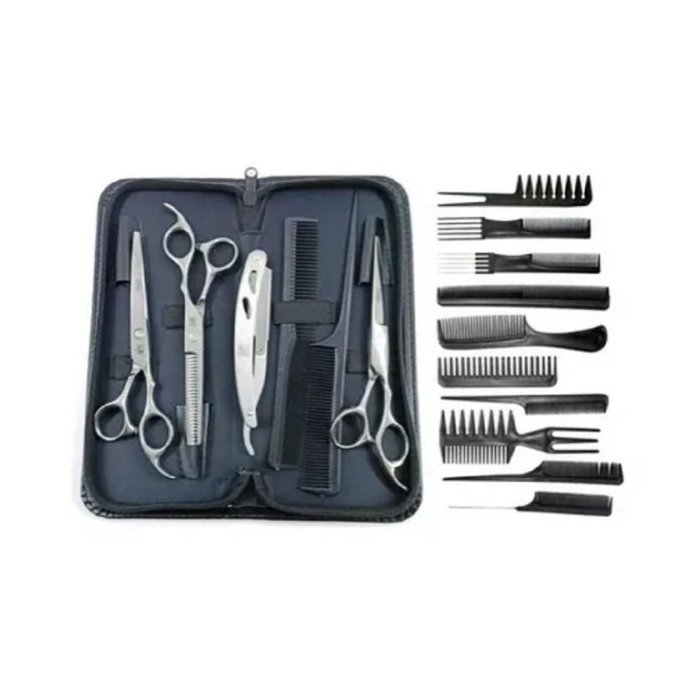 Kit perfeito para quem deseja trabalhar com produtos 100% novos e de alta qualidade! Ferramentas ideais para cabeleireiros e barbeiros. Tesouras com acabamento mais leves e resistentes. Suas composições preservam o funcionamento e afiação das tesouras por mais tempo. A navalha é indicada para barbear, dar acabamento ou finalizar cortes. Especificações das tesouras: 1 Tesoura Fio Navalha 6.0 polegadas 1 Tesoura Desfiadeira 6.0 polegadas 1 Tesoura Fio Laser 6.0 polegadas 1 Navalha Para Lâmina Lisa 1 Kit 10 Pentes Profissionais