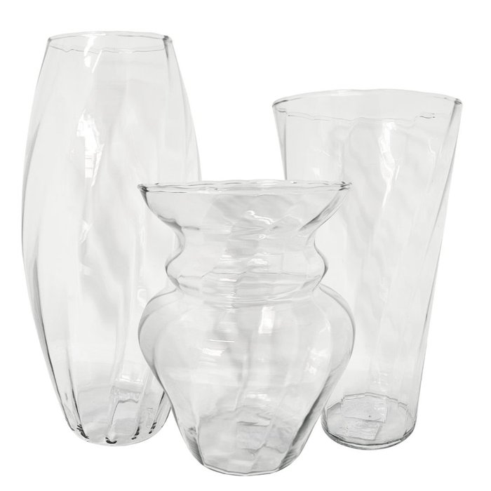 Eleve sua decoração a um nível superior com o kit de Vasos Decorativos de Vidro Rigado Ibiza, Áster e Oriental. Faça uma declaração de elegância e beleza em sua casa!