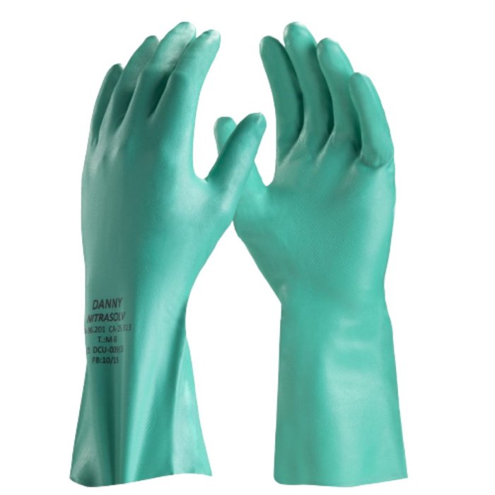 A luva de segurança Nitrasolv tem alta resistência química, proteção à abrasão e higienização, com formato anatômico e alto nível de sensibilidade. Antiderrapante, comprimento de 33cm. Hipoalergênica (isenta de látex).