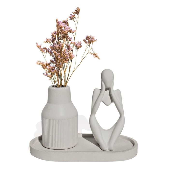 Kit 3pçs Decoração Estátua Pensadora Garrafa Tubo Listrada e Bandeja - Cinza Cinza
