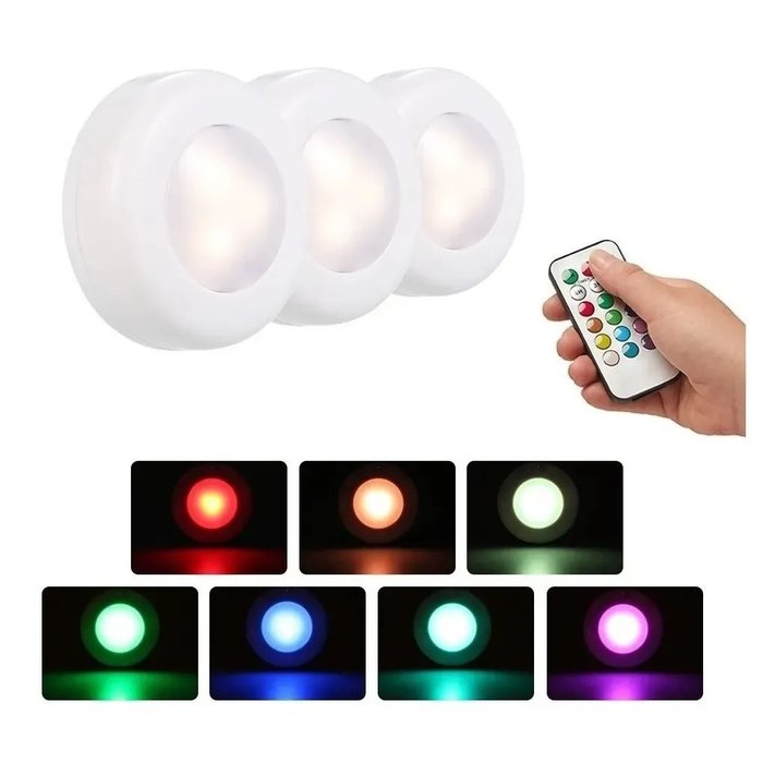 Kit com 3 lâmpadas de LED coloridas, voce escolhe a cor desejada quando quiser, individualmente ou em todas ao mesmo tempo. De fácil instalação, não requer nenhum tipo de fio, basta fixar com a fita duplaface que acompanha o produto e pronto!