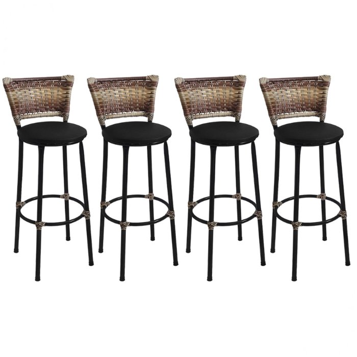 Kit 4 Banquetas Altas Preta com Encosto Junco Capuccino Assento Preto Preta
