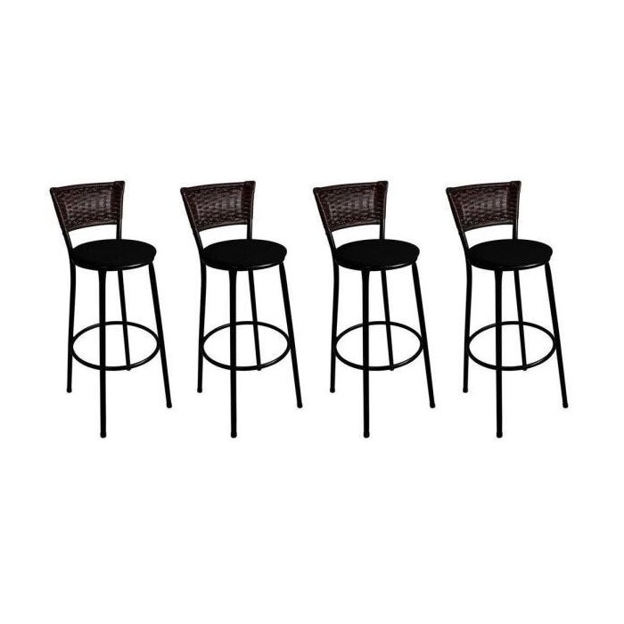 Kit 4 Banquetas Hawaii Bistrô Encosto Junco Marrom Pintura Epóxi Aço Preta Assento Preto