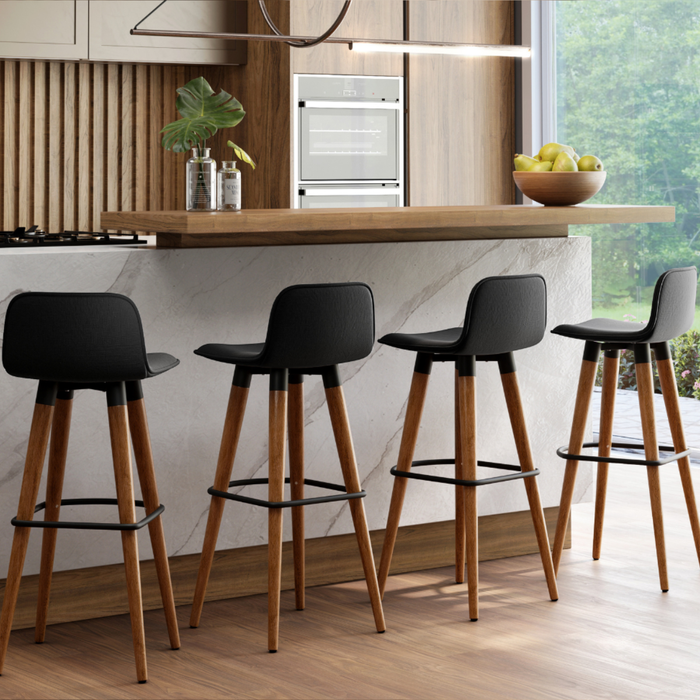 Design moderno, conforto e resistência para bancada, cozinha ou espaço gourmet. Assentos em linho e base em madeira maciça carvalho: elegantes, firmes e fáceis de montar.