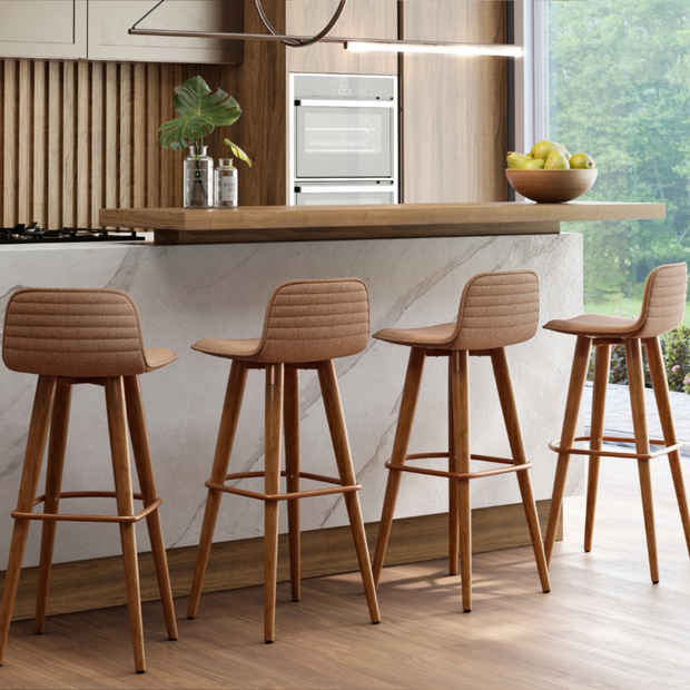 Design moderno, conforto e resistência para bancada, cozinha ou espaço gourmet. Assentos em linho e base em madeira maciça carvalho: elegantes, firmes e fáceis de montar.