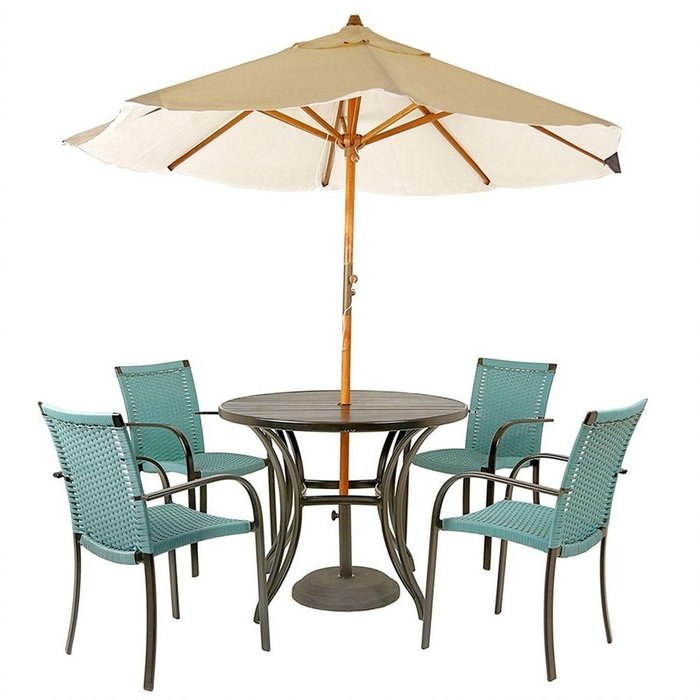 Kit 4 Cadeiras Ascoli Fibra Cor Azul Turquia + Mesa Ripado Preta + Central Bege - Ideal Jardim, Piscina