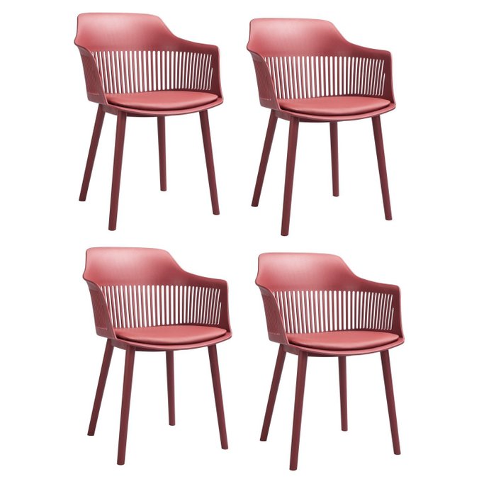 Conjunto com 04 cadeiras para uso em ambientes internos, com encosto não reclinável, assento injetado em polipropileno (PP), com almofada fixa no assento revestida em PU, sem ajuste de altura, com encosto para as costas. não possui braços, para uso doméstico.