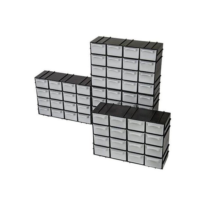 O Gaveteiro 7001 é ideal para organizar peças e itens pequenos. O gaveteiro possui um total de 16 gavetas cada sendo ele modular e permitindo encaixar uns nos outros. Também possui furação para fixação diretamente na parede.