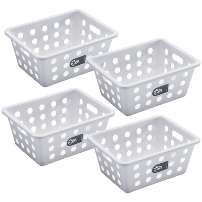 Kit 4 Caixas Organizadoras Plásticas Cestos Pequenos Alça Lateral Branca Coza<br><br>#Com aberturas laterais<br>#Caixa organizadora<br>#Multiuso<br><br>Garantia: 90 dias / Peso: 400g / Cor: Branco / Ref: 108080007X4<br>Dimensões de cada: 18cm (C) x 14cm (L) x 8cm (A) <br>Dimensões internas: 16,5cm (C) x 12cm (L) x 7,5cm (A) <br>Cuidados: Não lavar com materiais abrasivos <br>Comporta: Utensílios de Higiene, Utilidades<br>Conteúdo: 04 cestos.<br><br>Material: <br>- Polipropileno: Alta resistência apresenta uma superfície que dificulta o acúmulo de bactérias.<br><br>Os cestos pequenos podem ser usados na lavanderia, banheiro, closet, armários ou no escritório e gavetas, assim você organiza seus pertences. O conjunto é composto por 4 cestos na cor branco, produzidos em polipropileno e com pegas laterais que facilitam o transporte.