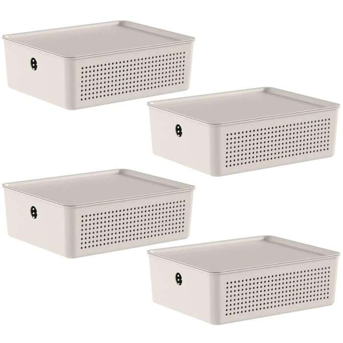 Kit 4 Cestos Organizadores Flow Bege com Tampa 5,4L Empilháveis Lavanderia Acessórios
