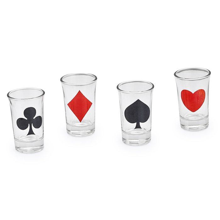 Jogo de copos de shot de vidro contendo quatro unidades com tema de baralho.
