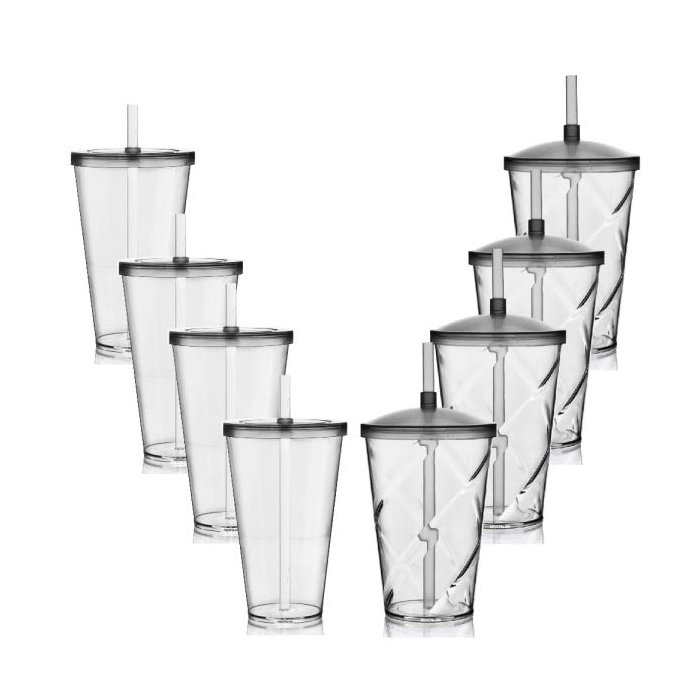 Especificações: Material Copos: Acrílico (Poliestireno), Altura 700ml: 15 cm, Altura 550 ml : 14,5 cm, Diâmetro 700 ml: 10 cm, Diâmetro 550 ml: 9,5 cm, Capacidade Twister: 700 ml Capacidade Shake: 550 ml, Cor: Transparente, Tamanho: Único, Quantidade: 8 peças (4 Copos com Tampa 700ml e 4 Copos com Tampa 550 ml)