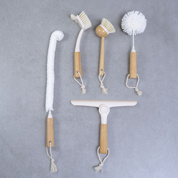 As escovas são de bambu, plástico e PET. O rodo é de bambu e plástico. Para limpar, basta lavar em água corrente com sabão neutro e deixar secar em local arejado.