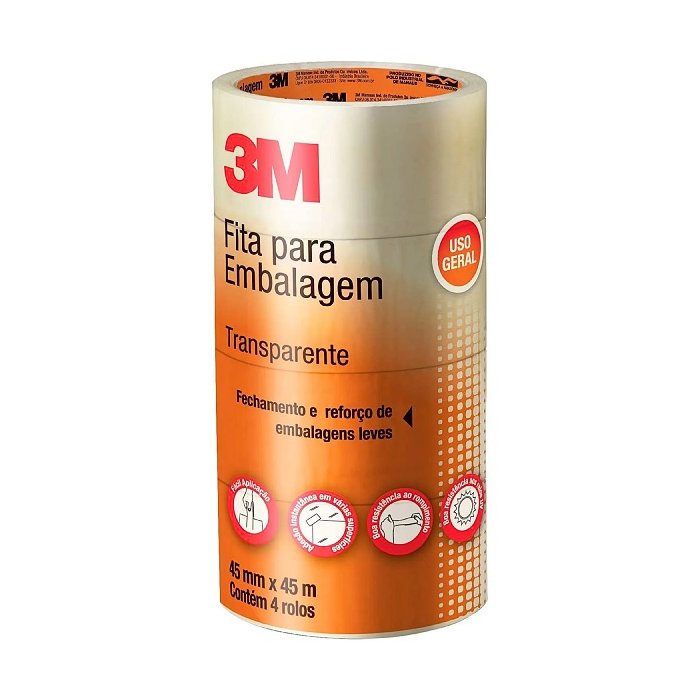 Fita Adesiva Para Embalagem 3M Transparente 48mm x 50 Metros c/ 4 Rolos