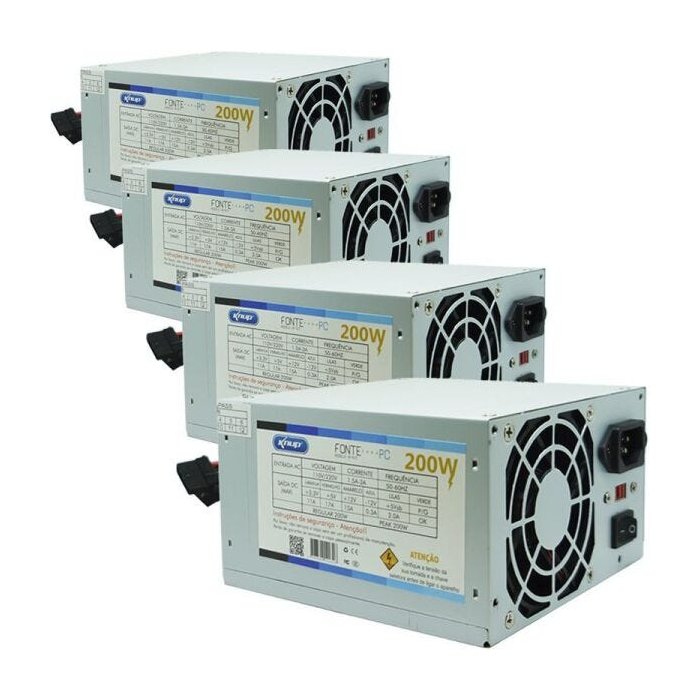 Design projetado para facilitar a ventilação, ventilador de 75mm, silencioso e de alta durabilidade, proteções internas contra curto-circuito, sobretensão e sobrecorrente, entrada AC com chaveamento manual (110-220V), excelente combinação de qualidade, performance e valor. Informações técnicas Produto: Novo Marca: Knup Modelo: KP-517 Cor: Cinza Tipo: Fonte ATX Compatibilidade: PC/Desktop Voltagem: 110/220V (bivolt chaveado) Potência: 200W Real Frequência: 50/60Hz Corrente: 1.5A ~ 3A Plug da tomada: 3 Pinos ABNT (Padrão brasileiro) Conectores - 1 Conector ATX 20+4 pinos - 1 Conector ATX 12V - 1 Conector Floppy - 2 Conectores SATA - 2 Conectores IDE Especificações - Proteção contra curto circuito - Ventilador de 75mm silencioso - Cabos com capa de proteção Peso e medidas (aproximados) Medidas da fonte: 8,5 x 14 x 15 cm (altura x largura x comprimento) Comprimento dos cabos: 120 cm Medidas da embalagem: 44 x 17 x 22 cm (altura x largura x comprimento) Peso: 4,40 Kg Itens inclusos: 4 Fonte, 4 Cabo de Força
