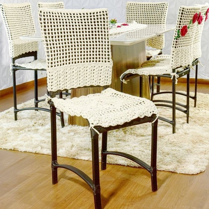 TRANSFORME O VISUAL DA SUA CADEIRA COM +QUALIDADE E +ESTILO AS FORMIDÁVEIS CAPAS DE CROCHÊ COM MAIS ELEGÂNCIA E CONFORTO Apresentamos para você as desejadas capas de cadeira de crochê exclusiva feito à mão. O crochê faz parte da decoração das casas brasileiras há vários anos. É um item que permite deixar sua mesa aconchegante e charmosa! As capas de crochê ficam um luxo em cadeira de madeira / ferro ou estofadas. Capa de Cadeira Crochê Exclusiva Charme do Detalhe. CAPA COM QUALIDADE COMPROVADA: Composição de Crochê Fio 100% Algodão Espessura da linha 4 por 6 Acabamento de Primeira Qualidade (pode lavar a vontade) Equipe pronta para te atender em todos os canais *Cuidamos de cada detalhe do seu pedido. MEDIDAS: - Encosto: 45 a 45cm - Assento: 45 a 45cm *com 4 tiras de cada lado para poder prender nas cadeiras Kit 4 = 4 unidades (Encosto + Assento) GARANTIAS: — Garantia de 7 dias: Você fica satisfeita OU tem 100% do seu dinheiro de volta. — Garantia contra defeitos: em caso de defeitos, providenciaremos um novo imediatamente para você. FAÇA HOJE O SEU PEDIDO!
