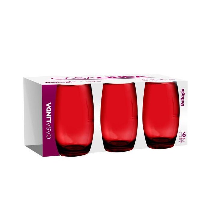 Kit 4 Jogos Copos Vidro Bellagio Vermelho Colorido 450ml