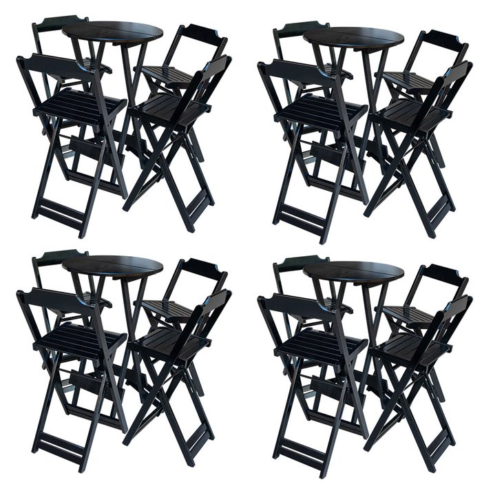 Kit 4 Jogos de Mesa Bistrô de Madeira com 4 Cadeiras Dobrável Ideal para Bar e Restaurante Preto é ideal para bares, restaurantes, estabelecimentos, áreas de lazer e tambem para sua casa. Feito em madeira maciça, tornando resistentes e duráveis. Seu design permite que seja encaixado em qualquer ambiente, trazendo um toque a mais para seu estabelecimento. Além de sua durabilidade, o que lhe trará conforto para servir seus clientes. Por ser dobrável torna-se mais fácil guardar, manusear e limpar o produto. Atenção: EVITE USAR PRODUTOS ABRASIVOS e QUíMICOS para LIMPEZA DO PRODUTO, aconselha-se o uso de pano umedecido para melhor conservação; mantenha o produto fora de chuva e sol constantes. OBS: MDF ULTRA MESA Cor: Preto Modelo: Bistrô Dobrável Dimensões: Altura 99cm | Largura 55cm | Profundidade 55cm CADEIRA Cor: Preto Modelo: Bistrô Dobrável Dimensões: Altura 100cm | Largura 38cm | Profundidade 37cm