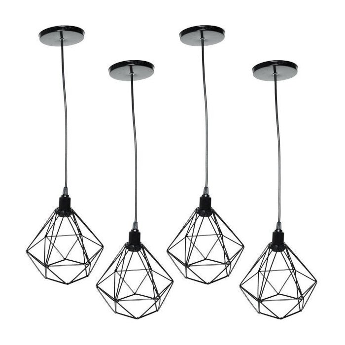 Kit 4 Luminárias Lustre Pendente Aramado Diamante Luxo Pequeno Teto Retrô Preto Agp Ilumini