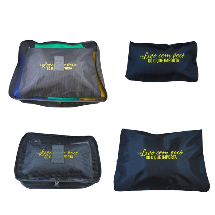 Kit 4 Organizador de Viagem Nossos organizadores são bem construídos e feitos de tecido muito forte, o material é leve, mas durável Total de 4 cubos de tamanhos diferentes. Estes cubos têm o tamanho perfeito para dividir calças, blusas, sutiãs/calcinhas, sapatos e cosméticos. Eles podem comprimir roupas quando fechados, criando mais espaço na sua bagagem Especificações Técnicas: Cor: Preto Tamanho GG 40 x 28 x 10 cm Tamanho G 35 x 25 x 30 cm Tamanho M 30 x 15 x 10 cm Tamanho P 25 x 12 x 20