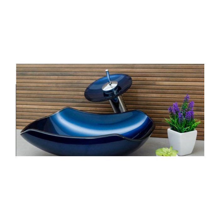 Dimensões: 53 x 39 x 14cm espessura: 12mm material: vidro temperado. kit 4 peças com cuba de vidro na cor azul, forma abaulada oval (canoa) BIG, válvula click cromada para lavatórios, torneira cascata de vidro temperado na cor azul e sifão cromado