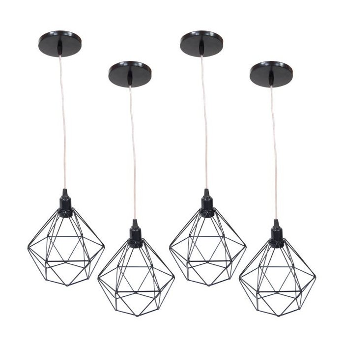 Kit 4 Pendente Aramado Diamante Luminárias Lustre Cabo Cristal Teto Retrô Preto Agp Ilumini